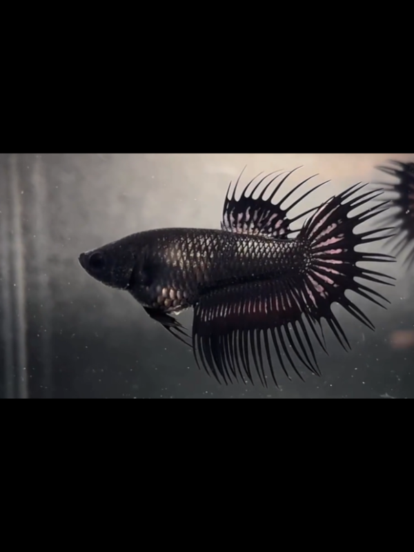 The Black Orchid CT Female showcases the same striking beauty as the male, with a deep black body accented by subtle iridescent blue and violet highlights along the fins. Her crowntail rays are shorter but well-defined, giving her a spiked, delicate silhouette that highlights her unique charm. Compact and graceful, she is perfect for display or as a premium breeder, carrying the genes for both the iconic black coloration and the extended crowntail fin structure.