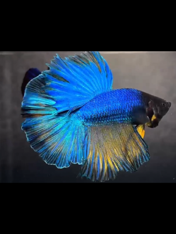 The Blue Mustard Gas HM Betta is a stunning Halfmoon variety distinguished by its rich blue body and contrasting mustard-yellow fins edged in a dark outline. Its coloration shimmers with depth and intensity, creating a dynamic balance between cool and warm tones. When fully flared, the 180° Halfmoon tail unfurls like a royal banner, showcasing perfect symmetry and refined elegance.