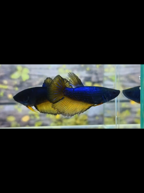 The Blue Mustard Gas HM Female combines strength and grace in a smaller, more refined form. Her body glows with vivid blue iridescence, contrasted beautifully by golden-yellow fins outlined in a subtle dark edging — the signature Mustard Gas trait. Although her fins are shorter than the male’s, the Halfmoon genetics remain visible in the broad caudal spread and balanced proportions.