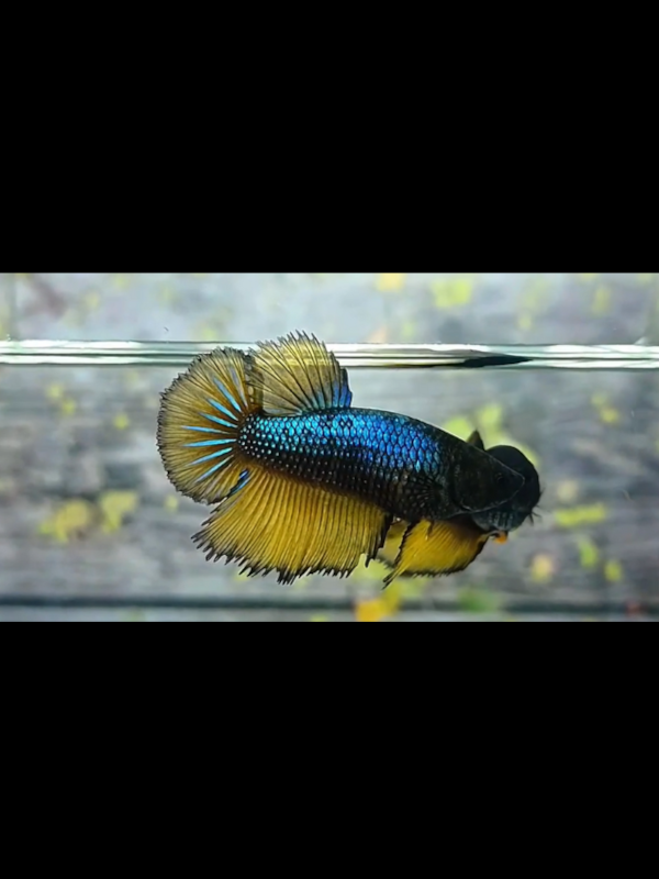 The Green Mustard Gas HM Female displays a metallic emerald-green body contrasted with mustard-yellow fins, softly outlined in dark edges — the signature “Mustard Gas” pattern. Her fins are shorter than the male’s but still exhibit Halfmoon tendencies, with a rounded caudal shape and graceful proportions. She is not only visually stunning but also a valuable breeder, carrying the genetics for intense coloration and well-formed Halfmoon tails.